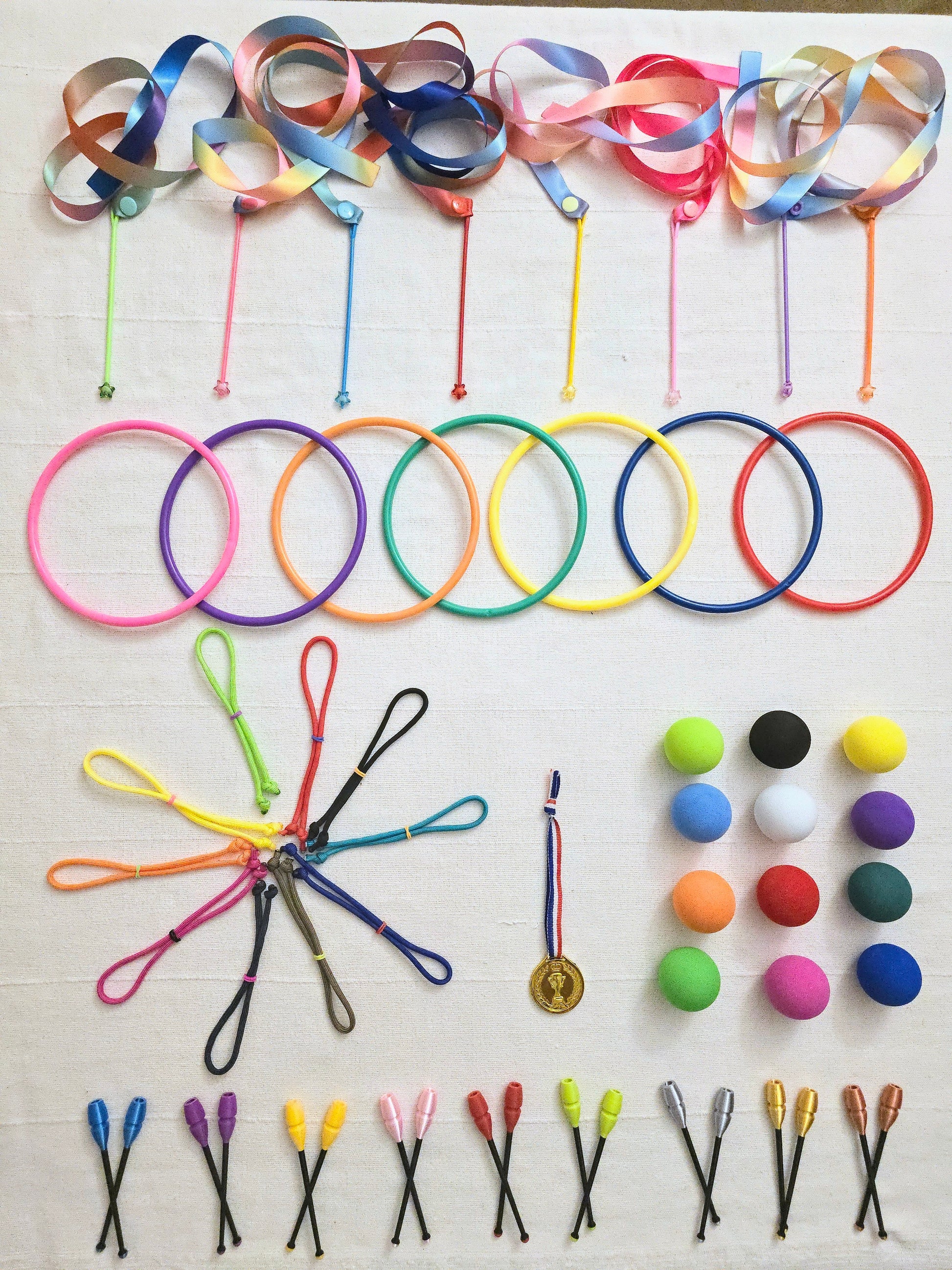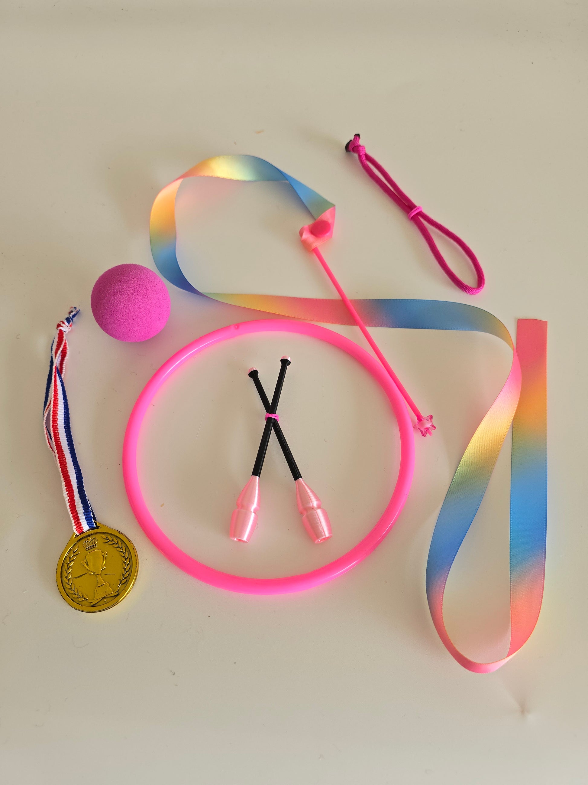 El Pack de Aparatos Rítmica incluye: Aro, Mazas, Pelota, Cinta, Cuerda y además la Medalla de la ilusión